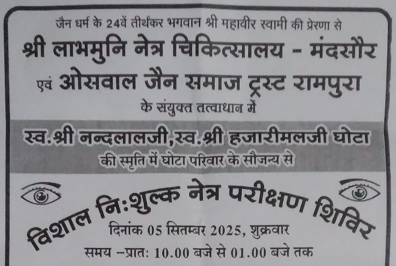 रामपुरा। श्री लाभ नेत्र चिकित्सालय मंदसौर एवं ओसवाल जैन समाज ट्रस्ट रामपुरा के संयुक्त तत्वाधान में स्वर्गीय श्री नंदलालजी,स्वर्गीय श्री हजारीमलजी घोटा की स्मृति में घोटा परिवार के सौजन्य से नगर में विशाल निशुल्क नेत्र परीक्षण शिविर का आयोजन दिनांक 5 सितंबर शुक्रवार को होगा। शिविर में सभी नेत्र रोगियों की नजर,चश्में,काला पानी,मोतियाबिंद,नासूर,पर्दे की बीमारी आदि की जांच निशुल्क की जाएगी। परीक्षण पश्चात ऑपरेशन योग्य मरीजों के मोतियाबिंद ऑपरेशन श्रीलाभुमुनी नेत्रालय मंदसौर में निशुल्क किए जाएंगे। ऑपरेशन अत्याधुनिक तकनीक बिना टाँके व अत्याधुनिक मशीनों की सहायता से किए जाएंगे। जिसमें मरीज को टांको से होने वाली असुविधा व आपरेशन के बाद चश्मा का नंबर ज्यादा आने की समस्या से आराम मिलेगा। ऑपरेशन के लिए भर्ती मरीजों को चाय बिस्किट भोजन एवं बिस्तर श्री लाभमुनी नेत्रालय द्वारा निशुल्क उपलब्ध कराए जाएंगे। मरीजों के साथ एक सहायक के नेत्रालय में रहने की अनुमति होगी किंतु सहायक को अपने लिए भोजन चाय बिस्तर इत्यादि की व्यवस्था स्वयं करनी होगी। मरीजों को नेत्रालय पहुंचाने की व्यवस्था निशुल्क रहेगी ऑपरेशन पश्चात प्रथम प्रशिक्षण एक सप्ताह बाद दूसरा परीक्षण एक माह बाद निर्धारित स्थल पर ही किया जाएगा। एवं ऑपरेशन के बाद आंखों में किसी भी प्रकार की समस्या होने पर नेत्रालय में 24 घंटे सेवाएं उपलब्ध रहेगी विशाल निशुल्क नेत्र प्रशिक्षण शिविर का आयोजन नगर के स्वास्तिक भवन टेलिफोन एक्सचेंज के पीछे नाका नंबर दो मानसा रोड रामपुरा में होगा।