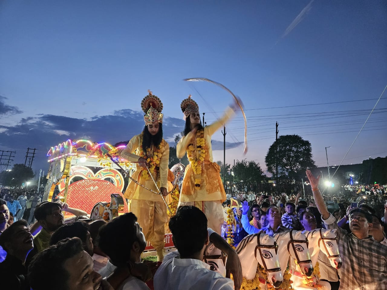 जो नगर के प्रमुख मार्गो से होता हुआ स्थानीय दशहरा मैदान पहुंचा जहां श्रीराम एवं लक्ष्मणजी के रूप में संस्कार सारू एवं कार्तिकेय सारू ने प्रतीकात्मक रूप से तीर-कमान चलाकर रावण का वध किया। तत्पश्चात भव्य आतिशबाजी के साथ रावण दहन हुआ इससे पूर्व चल समारोह का नगर में जगह-जगह पुष्प वर्षा एवं शीतल पेय पदार्थों के साथ स्वागत हुआ।